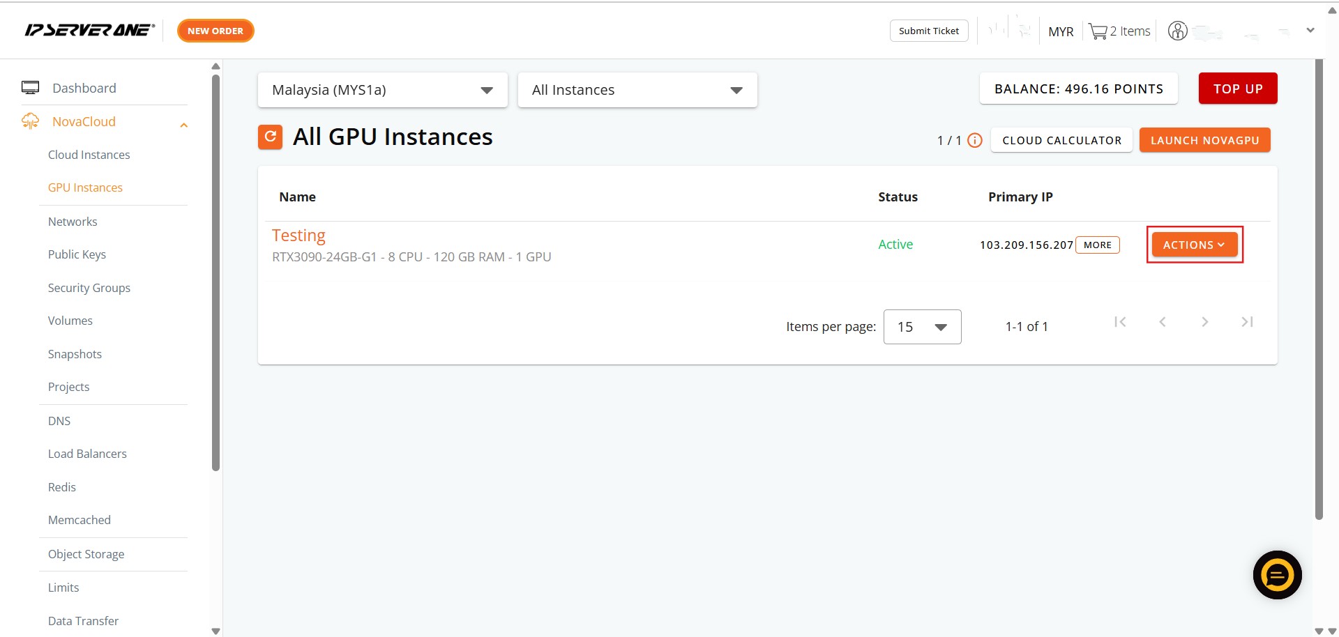 - From the expanded NovaCloud menu, locate and Click GPU Instances.