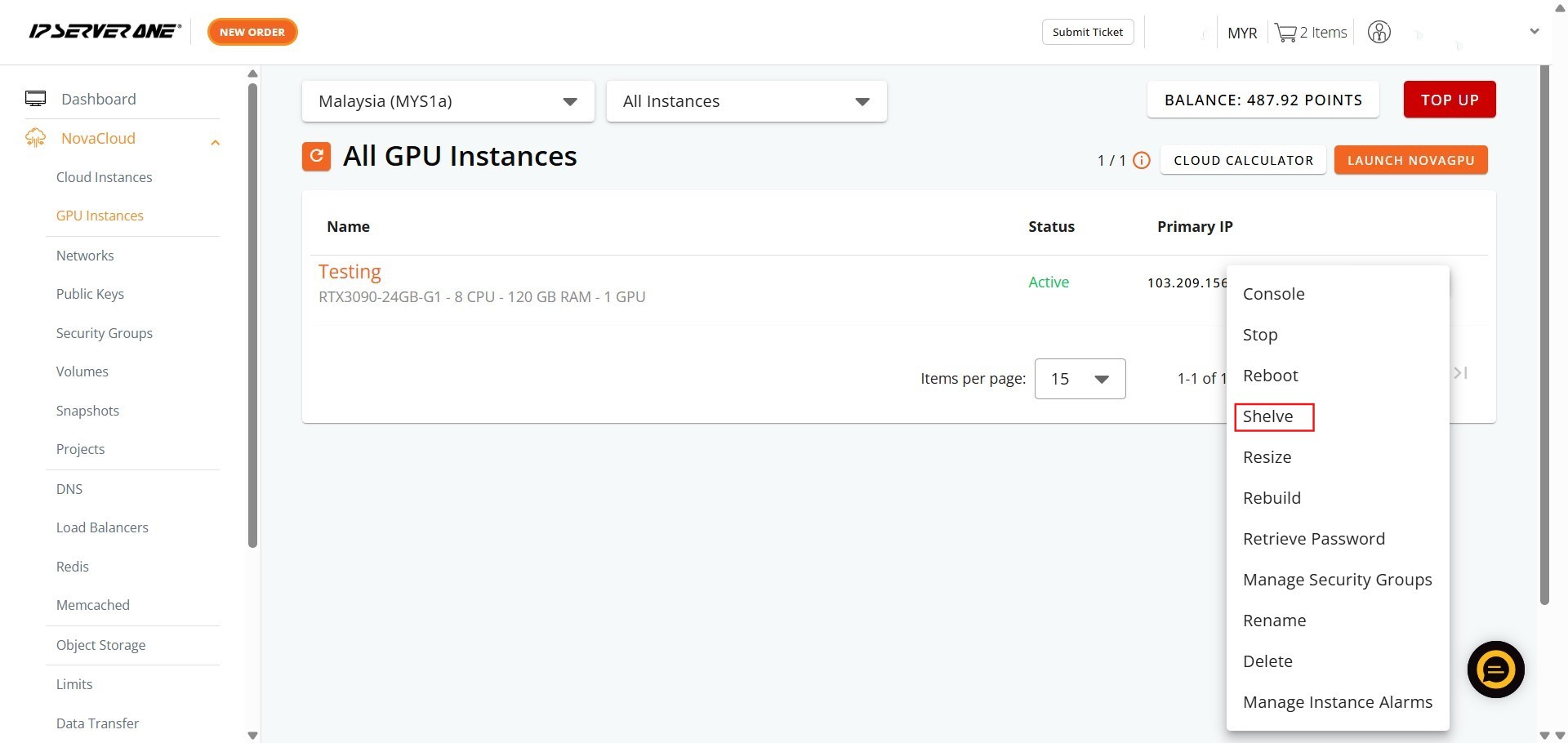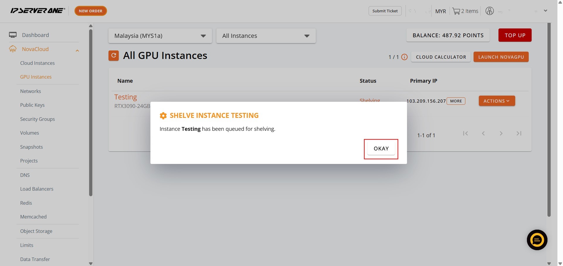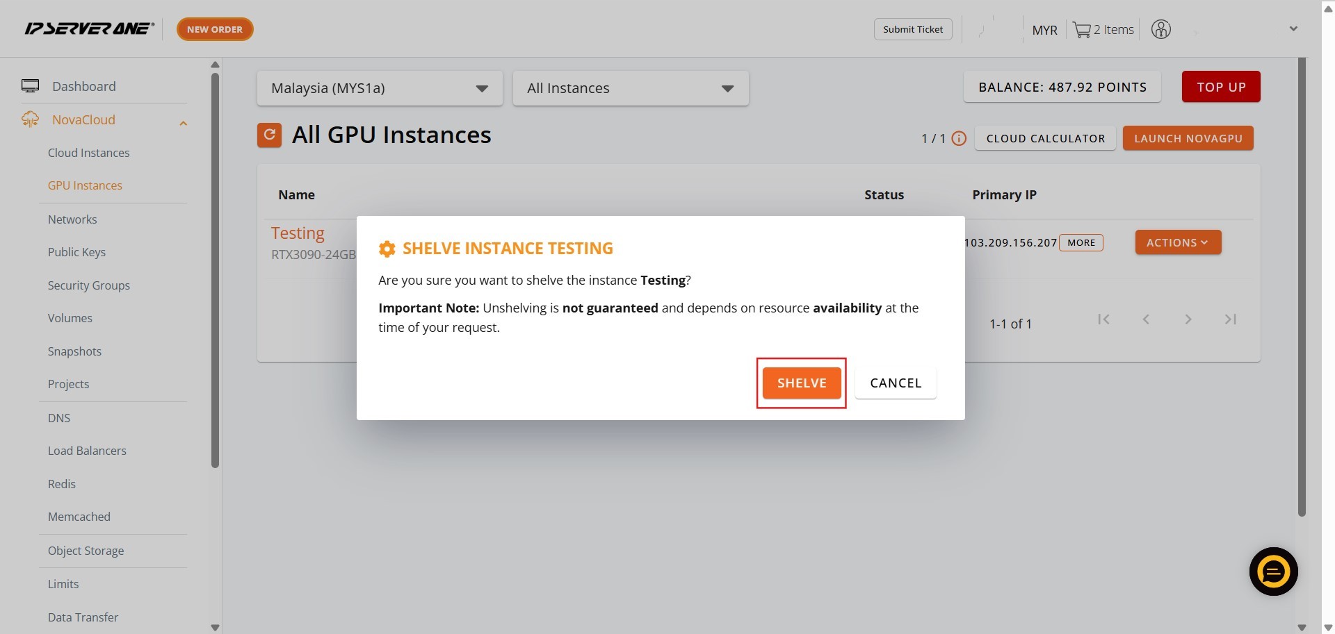 - The process is now complete. You can monitor the instance list to verify that the GPU Instance status has successfully updated to “Shelved”.