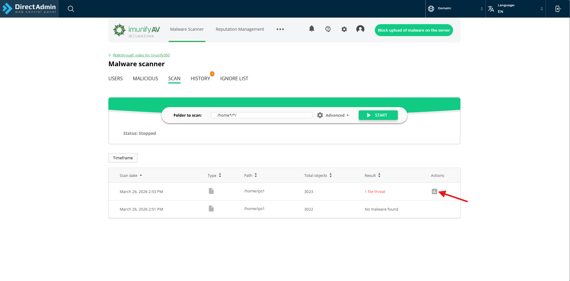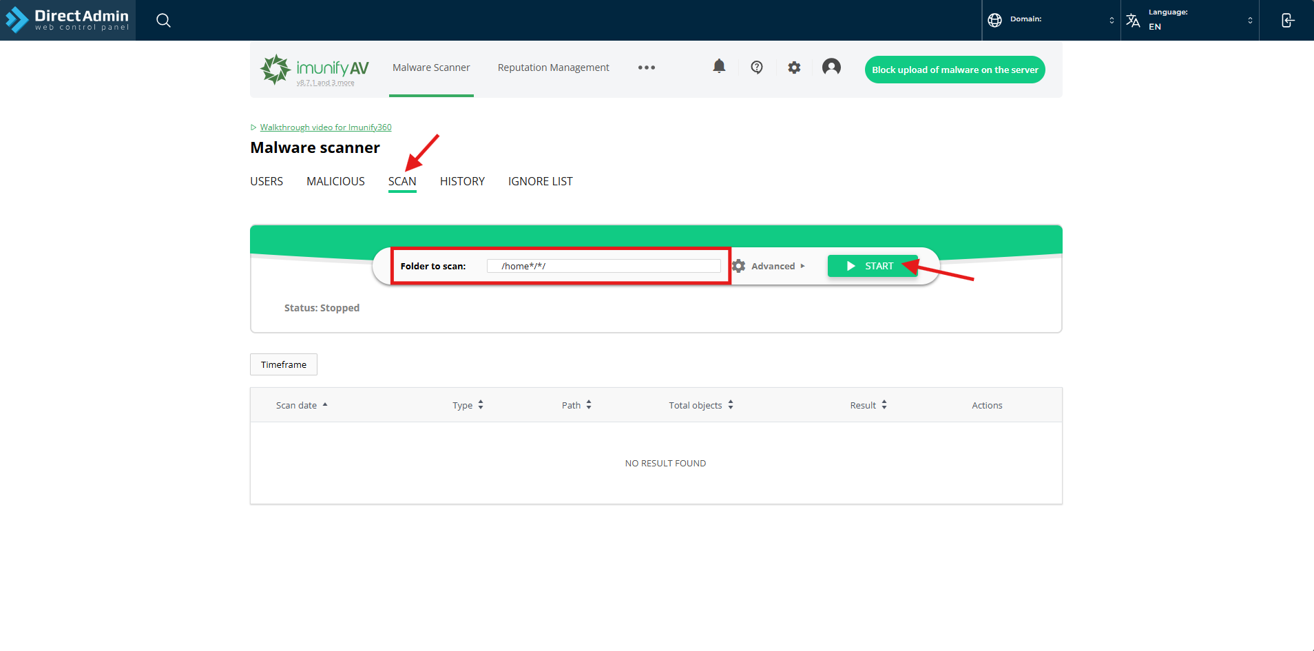 By following this guidance, you can successfully initiate a manual malware scan using the ImunifyAV interface in DirectAdmin, helping you to proactively secure your website and identify potential threats.