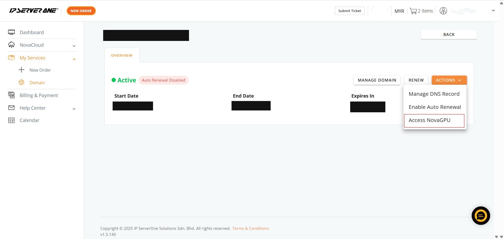 This guide is specifically designed to enable Customer Portal Users to efficiently access and manage their dedicated NovaGPU Site. To initiate access to these specialized GPU resources, users must begin their navigation within the customer interface, utilizing the steps linked to their domain registration. The required sequence of steps is My Service > Domain > View > Action > Access NovaGPU, which ultimately facilitates the necessary redirection to the GPU Instance Page for resource management. This process integrates the management of NovaGPU capabilities directly with the domain services section available in the Customer Portal.