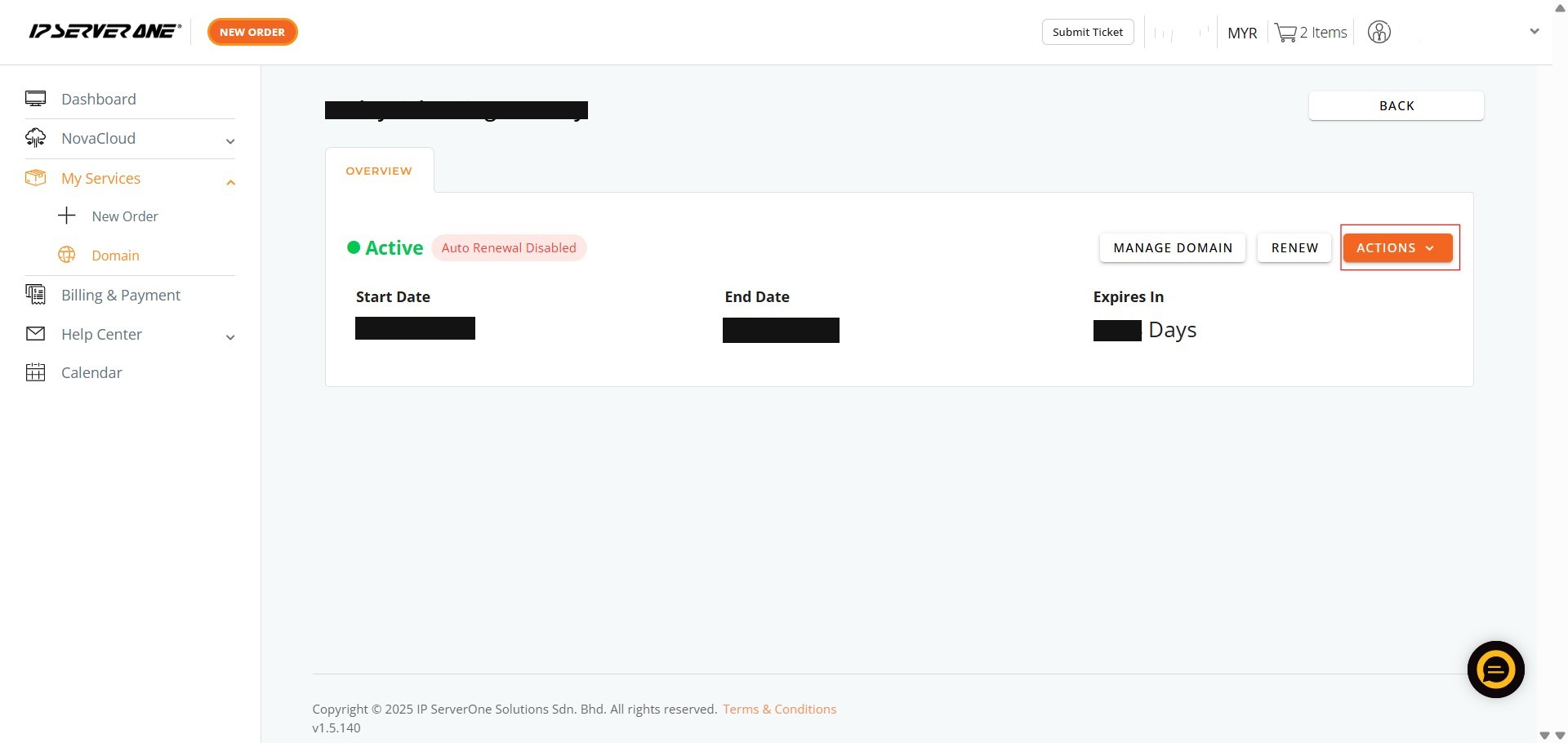• From the expanded My Services menu, locate and click Domain, this option designated for domain registration management.
