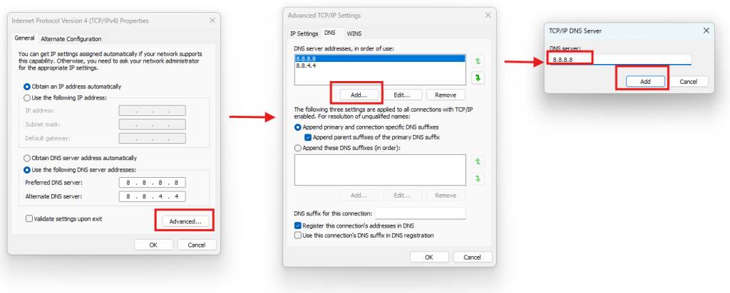 4. Click on Advanced and then DNS tab. Use the add button to add the following DNS server in the DNS server list.