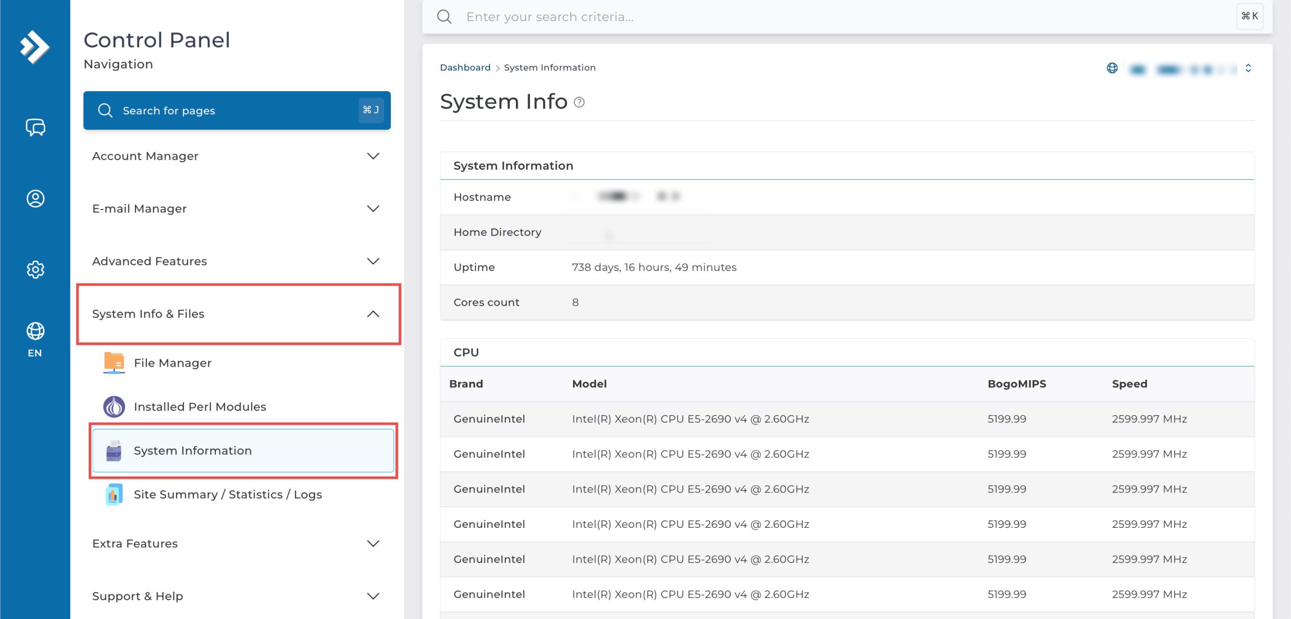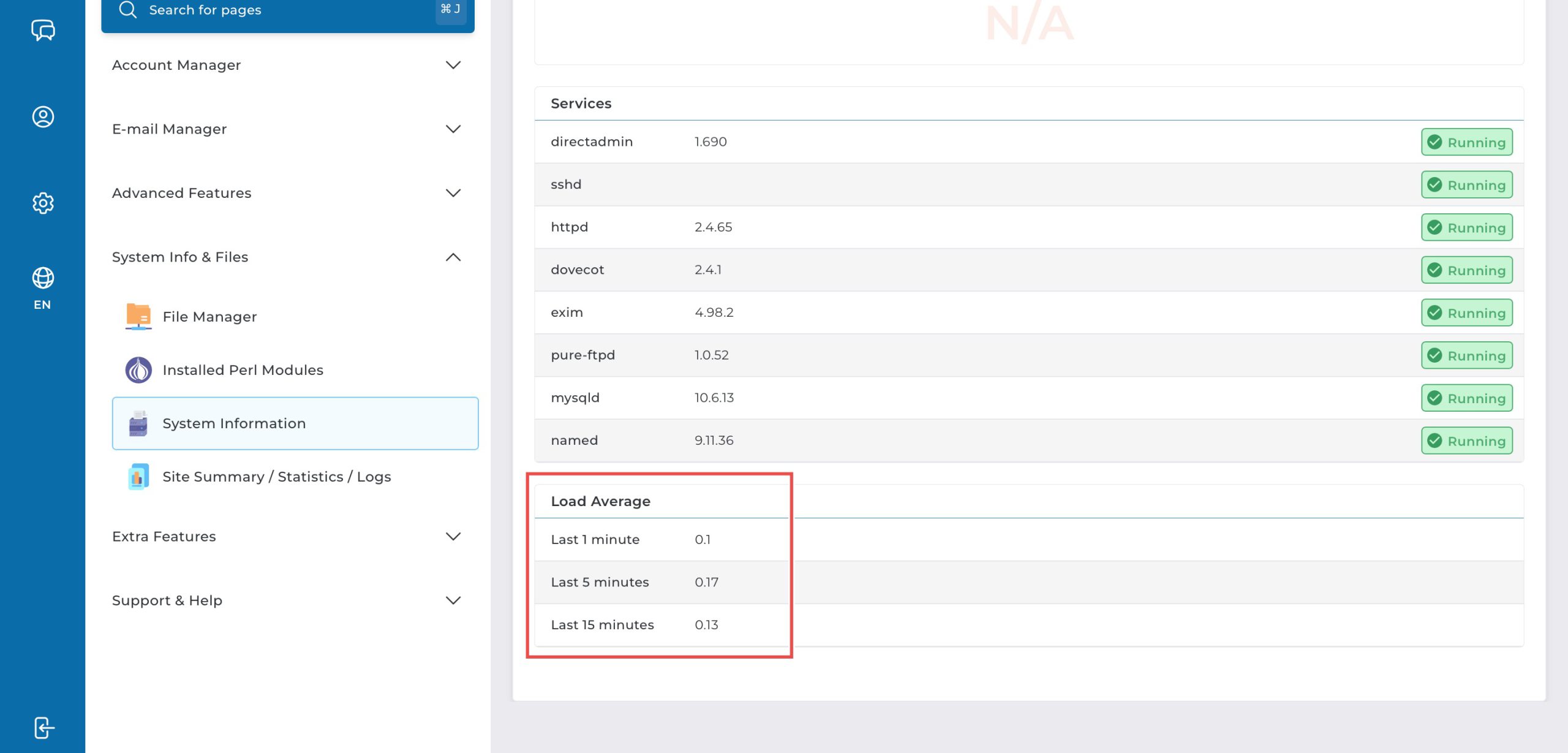 Server load average measures the number of processes waiting for CPU resources over specific time intervals, providing essential insight into system performance and resource demands. Monitoring load averages helps identify performance issues, plan capacity upgrades, or troubleshoot periods of high server activity. DirectAdmin’s System Information interface displays load average data across multiple time intervals, showing both current and historical system load patterns. This guide explains how to check server load average using the System Info & Files > System Information section in DirectAdmin, enabling you to assess server performance and identify potential resource constraints.