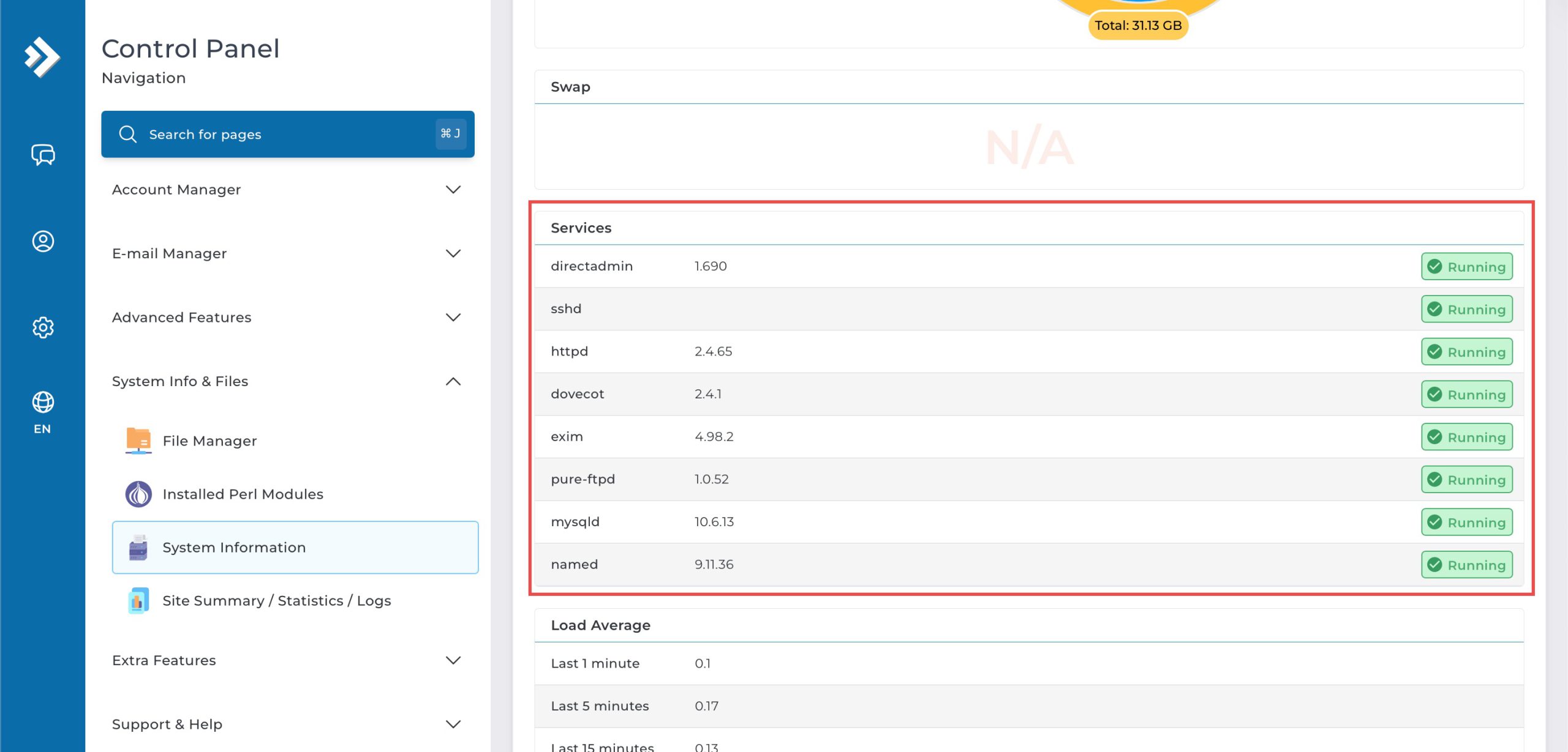 Checking service status through DirectAdmin’s System Information interface is a straightforward process that provides visibility into essential system components. Monitoring service availability and versions helps you maintain system health, identify potential issues quickly, and ensure all critical functions are operating as expected.
